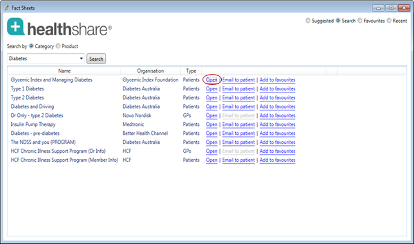 - Select the closest match for your search and click the Search button. Healthshare will populate the list with associated fact sheets.