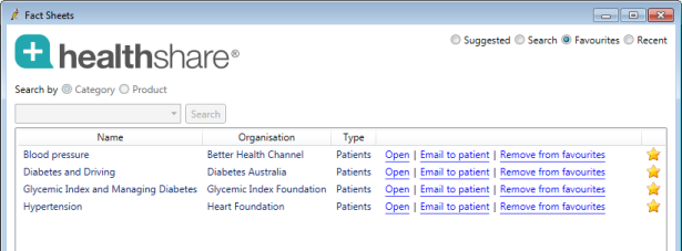 Favourite | List fact sheets that you have saved as a favourite. If you have a Favorites list, Healthshare will default to this filter. |